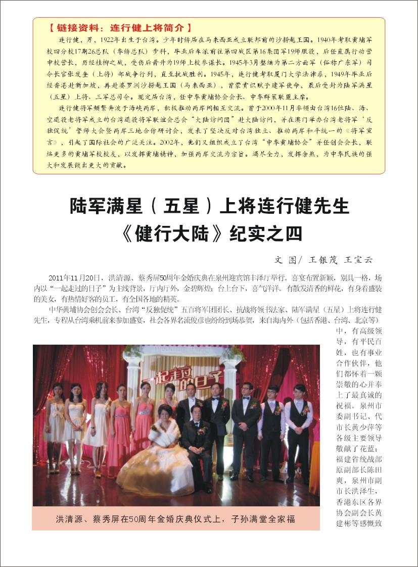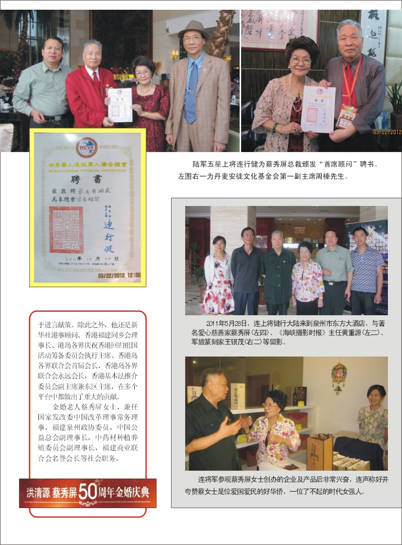 中华黄埔协会创会会长、台湾“反独促统”五百将军团团长、抗战将领书法家、陆军满星(五星)上将连 行健先生,专程从台湾乘机前来参加盛宴,社会各界名流俊彦也纷纷到场恭贺,来自海内外(包括香港、台湾、北京等)中,有高级领导,有平民百姓,也有事业合作伙伴,他们都怀着一颗崇敬的心并奉上了最真诚的祝福。泉州市委副书记、代市长黄少萍等各级主要领导敬献了花蓝;福建省统战部原副部长陈田爽,泉州市副市长洪泽生,香港东区各界协会副会长黄建彬等感慨致辞。军旅篆刻家王银茂还选用中国国石——福建寿山石龙凤对章为金婚老人洪清源、蔡秀屏夫妇篆刻姓名印章纪念(见封底)。