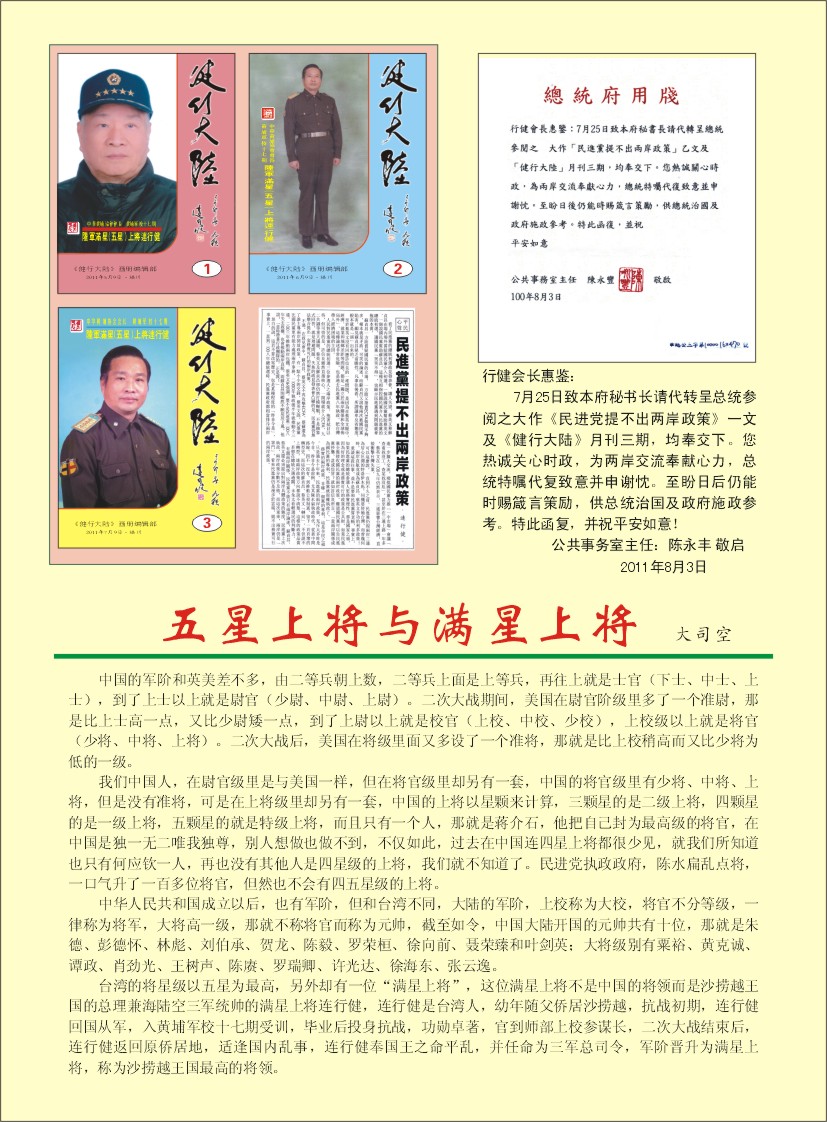 7月25日致本府秘书长请代转呈总统参阅之大作《民进党提不出两岸政策》一文及《健行大陆》月刊三期,均奉交下。您热诚关心时政,为两岸交流奉献心力,总统特嘱代复致意并申谢忱。至盼日后仍能时赐箴言策励,供总统治国及政府施政参考。特此函复,并祝平安如意!