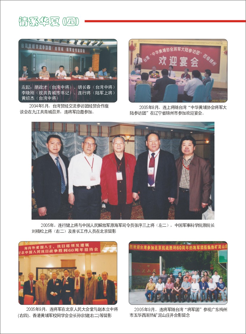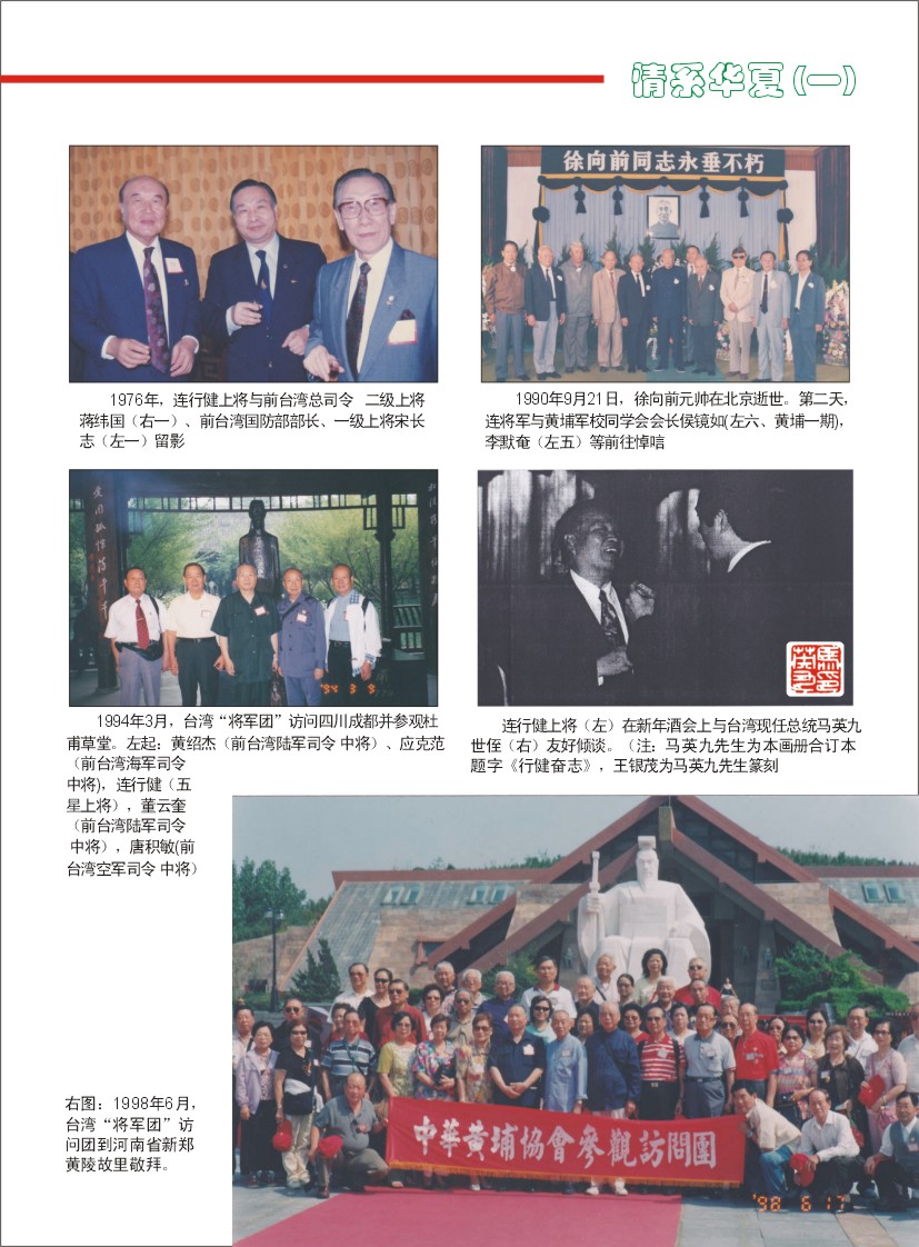 连 行健将军频繁奔波于海峡两岸,积极推动两岸间相互交流。曾于2000年11月率领由台湾16位陆、海、空退役老将军成立的台湾退役将军联谊会总会“大陆访问团”赴大陆访问,并在澳门举办台湾老将军‘反独促统’誓师大会暨两岸三地合作研讨会,发表了坚决反对台湾独立、推动两岸和平统一的《将军宣言》,引起了国际社会的广泛关注。2002年,他们又组织成立了台湾“中华黄埔协会”并任创会会长,联络更多的黄埔军校校友,以发挥黄埔精神,加强两岸交流为宗旨。竭尽全力,发挥余热,为中华民族的强大和发展做出更大的贡献。