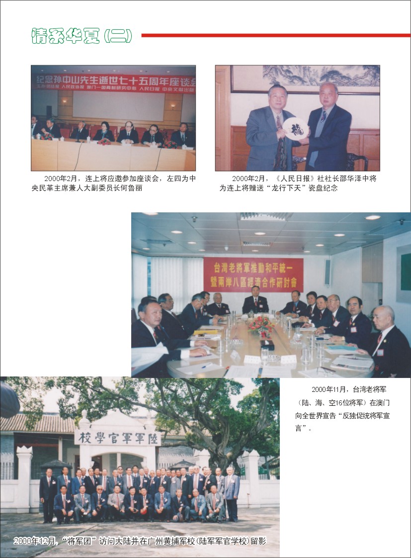 返回台湾后,他致力于祖国统一,亲自担任中华黄埔协会创会会长、中华群策联盟主席、世界华人退伍军人联合总会的总会长等职。他凭着自己在台湾的声望,近年来经常组织访问团来大陆参观访问,奔走两岸之间,推动两岸民众交流。为实现两岸人民和平统一事业做出了卓越的贡献。