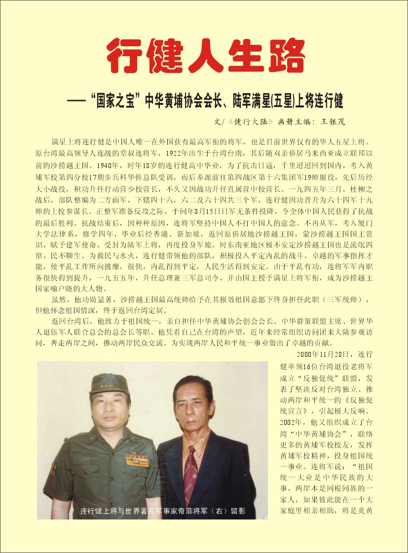 满星上将连 行健是中国人唯一在外国获有最高军衔的将军,也是目前世界仅有的华人五星上将。原台湾最高领导人连战的堂叔连将军,1922年出生于台湾台南,其后随双亲侨居马来西亚成立联邦以前的沙捞越王国。1940年,时年18岁的连行健高中毕业,为了抗击日寇,千里迢迢回到国内,考入黄埔军校第四分校17期步兵科华侨总队受训,而后奉派前往第四战区第十六集团军19师服役,先后历经大小战役,积功升任行动营少校营长,不久又因战功升任直属营中校营长。一九四五年三月,桂柳之战后,部队整编为二方面军,下辖四十六,六二及六十四共三个军,连行健因功晋升为六十四军十九师的上校参谋长。正整军准备反攻之际,于同年8月15日日军无条件投降,令全体中国人民获得了抗战的最后胜利。抗战结束后,因种种原因,连将军坚持中国人不打中国人的意念。不再从军,考入厦门大学法律系,修学四年,毕业后经香港、新加坡,返回原侨居地沙捞越王国,蒙沙捞越王国国王赏识,赋予建军使命,受封为陆军上将,再度投身军旅。时东南亚地区极不安定沙捞越王国也是流氓四窜,民不聊生。为救民与水火,连行健带领他的部队,积极投入平定内乱的战斗。卓越的军事指挥才能,使平乱工作所向披靡,很快,内乱得到平定,人民生活得到安定。由于平乱有功,连将军军内职务很快得到提升,一九五五年,升任总理兼三军总司令,并由国王授予满星上将军衔,成为沙捞越王国家喻户晓的大人物。