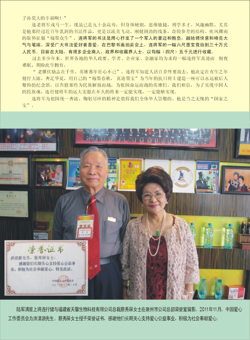 “ 老骥伏励志在千里,英雄暮年壮心不己”。连 将军知道人活百岁终要故去,他决定在有生之年健行大陆,奔足华夏,用自己的“翰墨春秋, 真迹墨宝”为当年的抗日将士建造一座可以永远被后人敬仰的纪念馆,以告慰那些为民族解放而战,为祖国命运而战的英雄们。我们相信,为了实现中国人的民族魂,连 行健将军的远大宏愿在不久的将来一定能实现,一定能够实现。