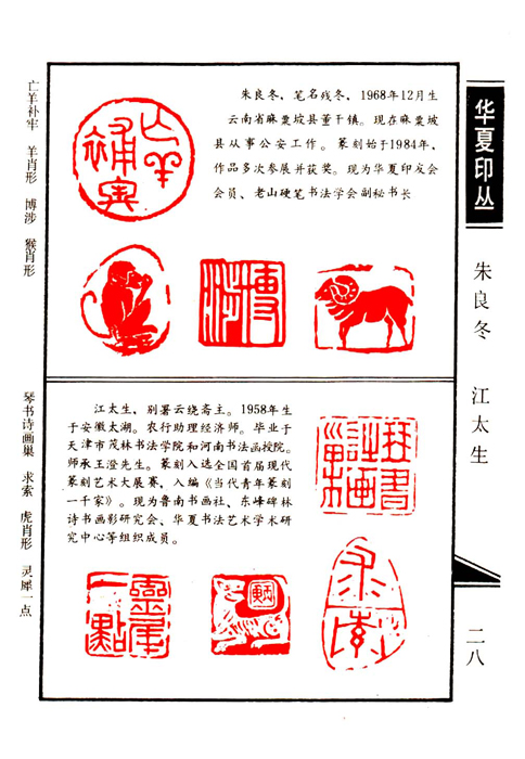 《华夏印丛》第28页 篆刻作者:朱良冬(朱良冬,笔名残冬,1968年12月生,云南省麻粟坡县董干镇。现在麻粟坡县从事公安工作。篆刻始于1984年,作品多次参展并获奖。现为华夏印友会会员、老山硬笔书法协会副秘书长。)