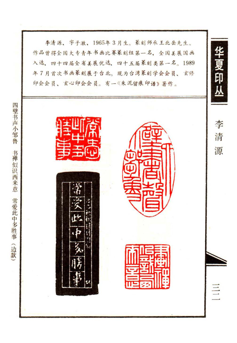 《华夏印丛》第32页 篆刻作者:李清源(李清源,字子澈,1965年3月生。篆刻师承王北岳先生。作品曾得全国大专青年书画比赛篆刻组第一名,全国美展国画入选,四十四届全省美展优选,四十五届篆刻类第一名。1989年7月首次书画篆刻展于台北。现为台湾篆刻学会会员、玄修印会会员、玄心印会会员。有一《朱泥留痕印谱》著作。)