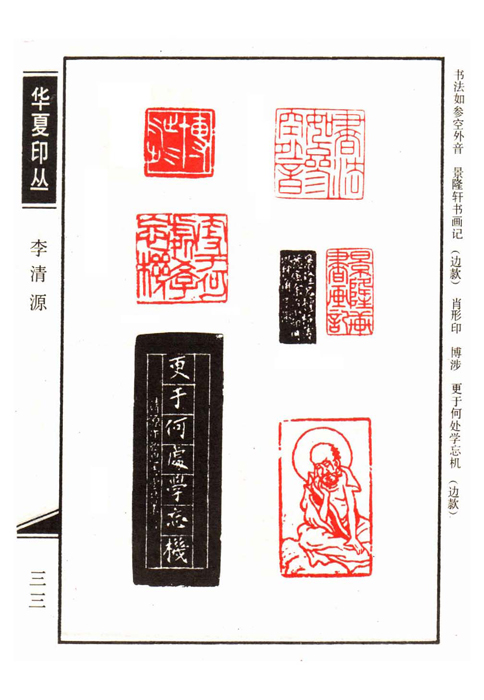 《华夏印丛》第33页 篆刻作者:李清源(李清源,字子澈,1965年3月生。篆刻师承王北岳先生。作品曾得全国大专青年书画比赛篆刻组第一名,全国美展国画入选,四十四届全省美展优选,四十五届篆刻类第一名。1989年7月首次书画篆刻展于台北。现为台湾篆刻学会会员、玄修印会会员、玄心印会会员。有一《朱泥留痕印谱》著作。)