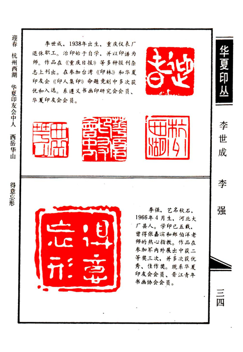 《华夏印丛》第34页 篆刻作者:李世成(李世成,1938年出生,重庆仪表厂退休职工.。治印始于自学,并以印谱为师。作品在《重庆日报》等多种报刊杂志上刊出。在参加台湾《印林》和华夏印友会《印人印集》命题竟刻中多次获优和入选。系遵义书画印研究会会员、化学印友会会员。)