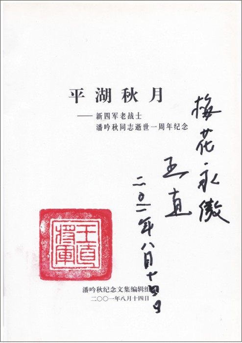 2011年8月16日上午,王直将军为纪念夫人潘吟秋逝世十一周年特在《平湖秋月》扉页上题字:红梅永傲