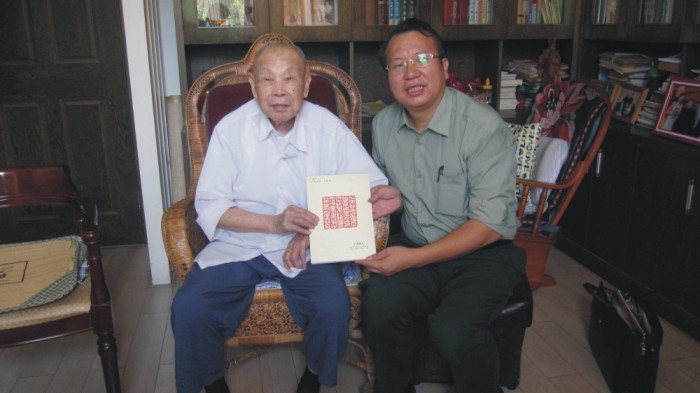 2011年8月15日,王直将军与《平湖秋月》封底篆刻作者王银茂留影