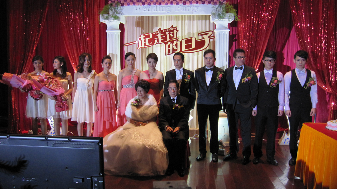 台上“一起走过的日子”全家福。祝贺幸福老人洪清源、蔡秀屏子孙满堂