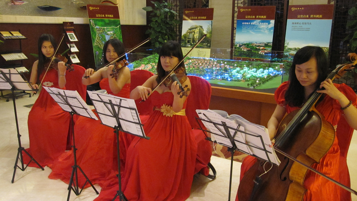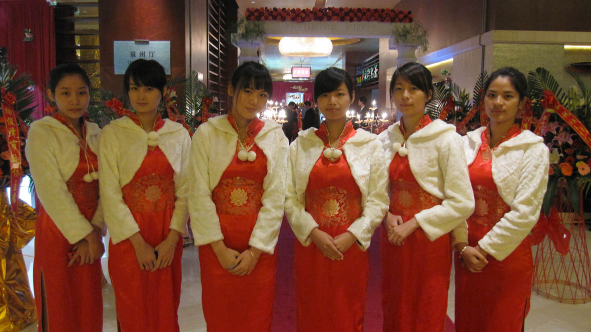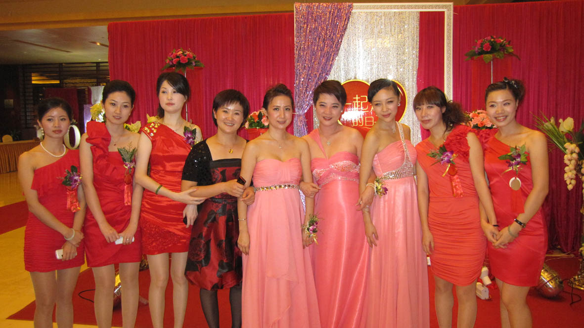 前台喜庆盛装的工作人员留影(左三:王宝云、左五:小吴)
