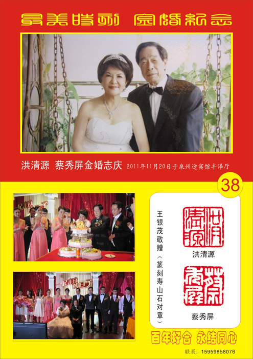 洪清源 蔡秀屏金婚纪念照 2011年11月20日晚六时于泉州迎宾馆丰泽厅承庆子洪子鑫、洪子烨、女洪雅静偕眷邀请 (本印谱十年后结集出版)