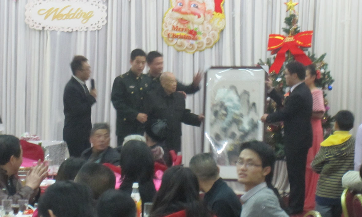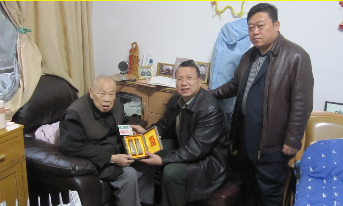 参加新人婚礼前,老红军、原福州军区副政委王直老将军称赞王银茂秘书为结婚新人篆刻的寿山石对章很有纪念意义。右一为中国毛泽东红色文化促进会创会会长郭振中先生(大连)