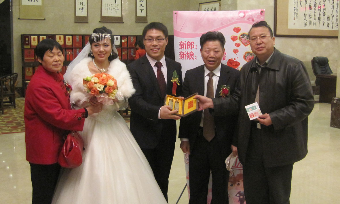 王银茂(右一)为新郎新娘赠送福建寿山石对章并与新郎父母亲留影
