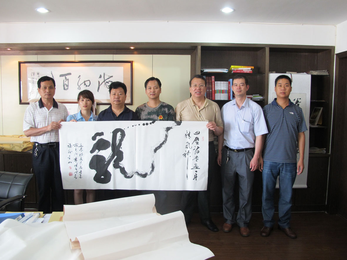 40. 李桂强、王银茂一行在福州西湖畔天邑茶业公司挥毫泼墨 图为李桂强书法作品:沁园春.雪 左二为王道辉董事长、右二为警官龚卫平