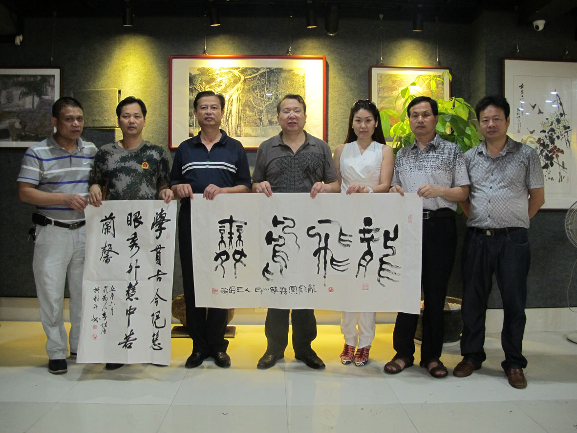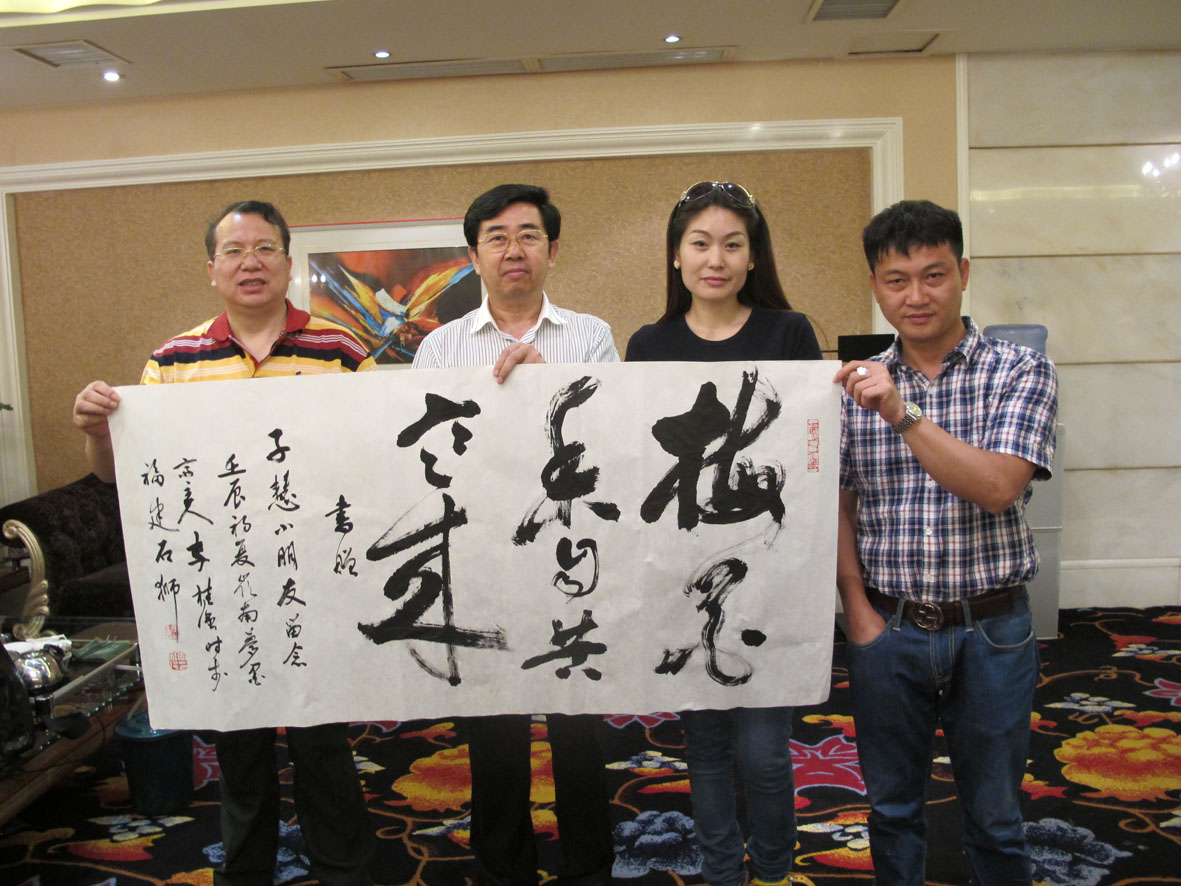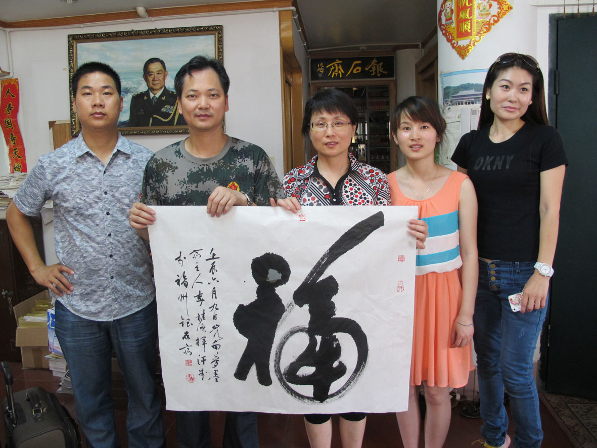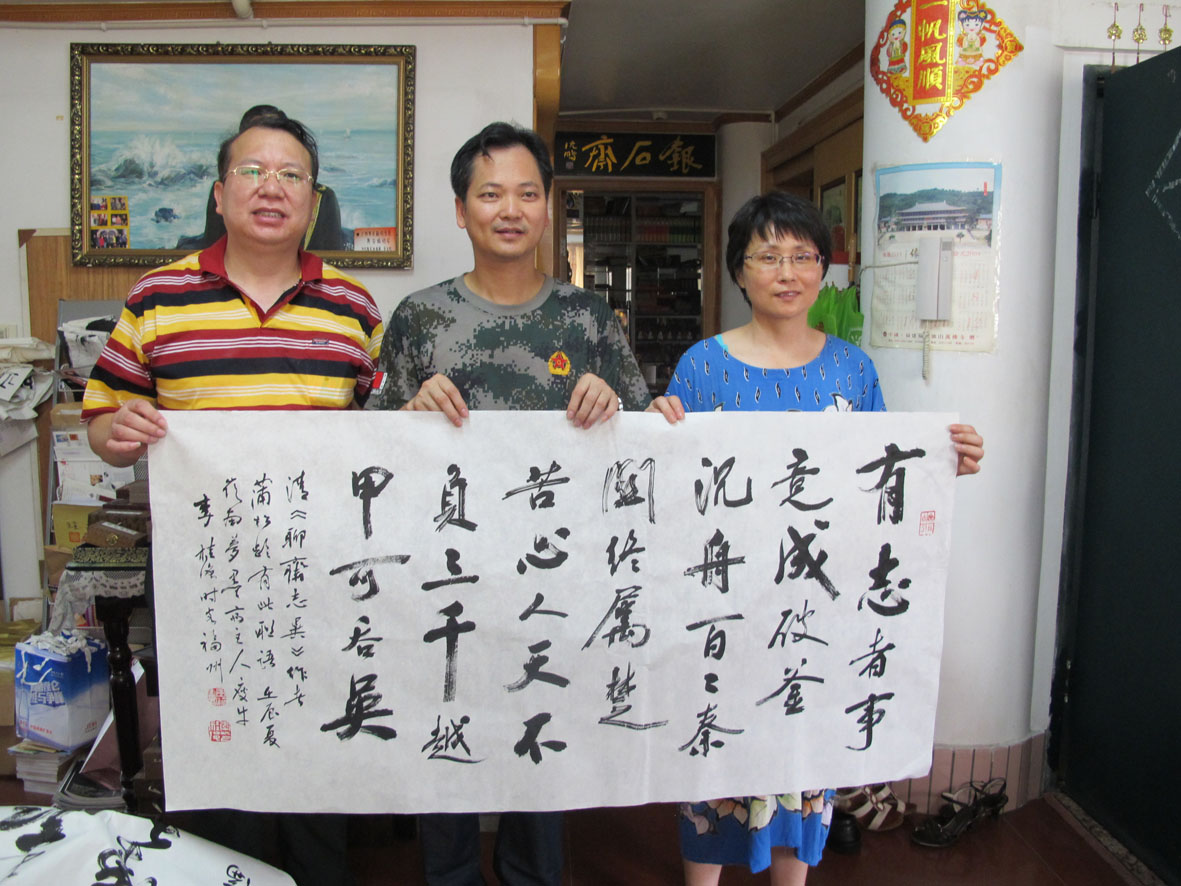 20. 李桂强在福州银石斋创作书法作品并留影 左起:林荣欣、李桂强、林捷、卓翠陈、蔡丹 (三组)