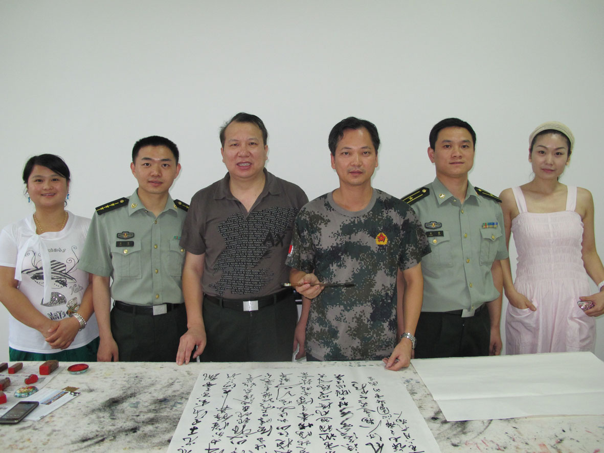 31. 军旅书法家李桂强、军旅篆刻家王银茂等艺术家们走进驻厦某部队宾馆进行慰问创作 左起:文明、小甘、王银茂、李桂强、小黄、蔡丹