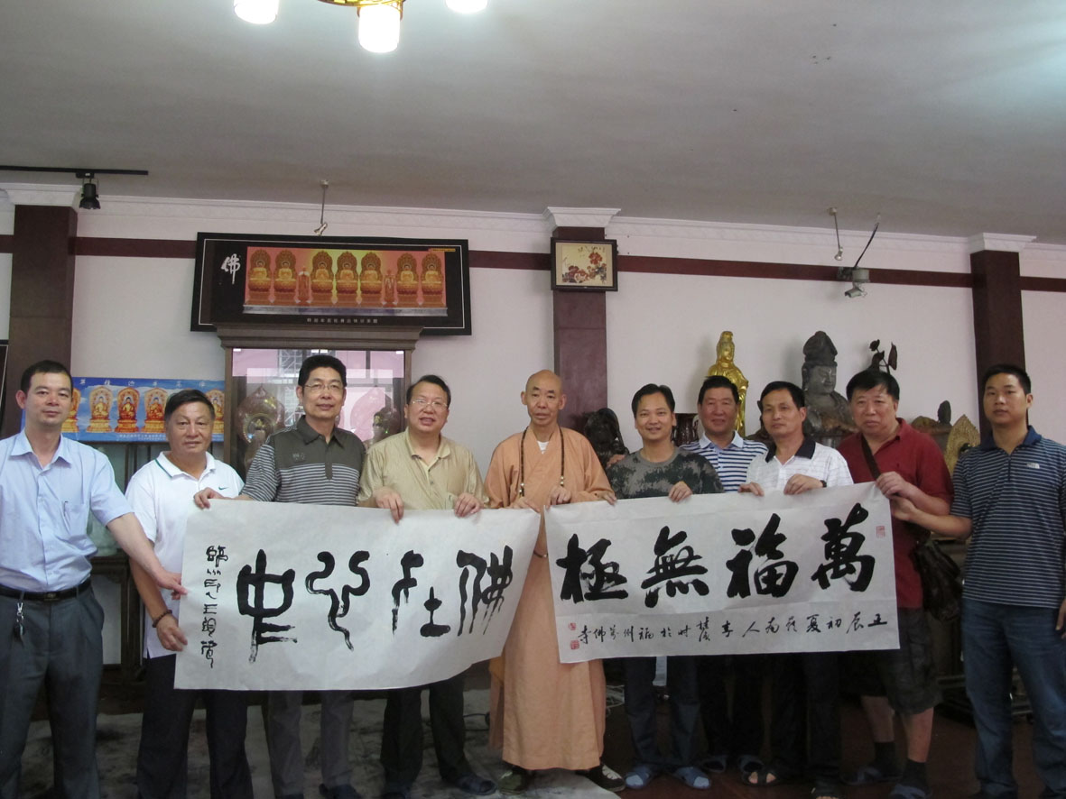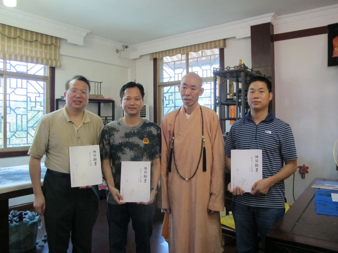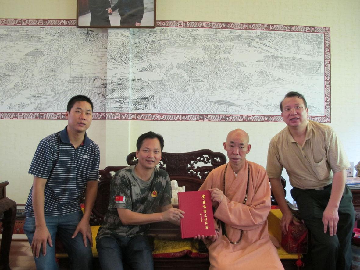 5. 广州著名书法家李桂强赠送个人出版的书法专集,并与万佛寺方丈释广霖留影 左起:林荣欣、李桂强、释广霖、王银茂
